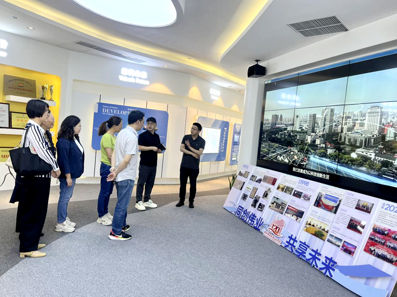 唐院長一行首先參觀了維科集團(tuán)展廳。維科集團(tuán)董事會秘書、總干部部副總經(jīng)理張翔全程陪同講解。重點(diǎn)介紹了維科集團(tuán)起源120周年的發(fā)展歷程,以及“不忘纖維科技初心,聚焦綠色能源科技”的使命愿景,詳細(xì)介紹了維科新材料、新能源、新物聯(lián)的產(chǎn)業(yè)布局及發(fā)展情況。