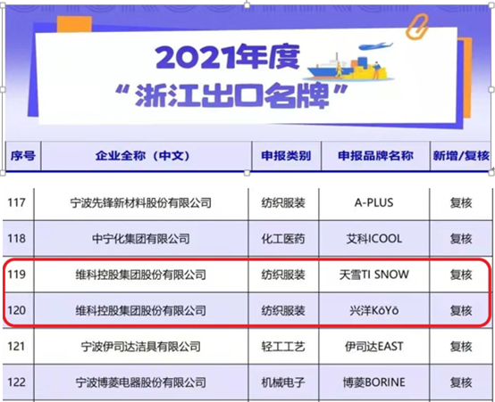 近日,浙江省商務(wù)廳公布了2021年度“浙江出口名牌”名單,維科集團(tuán)旗下興洋KOYO、天雪TI SNOW兩個(gè)品牌順利通過復(fù)核,再獲“浙江出口名牌”殊榮,有效期三年(2022-2024年)。