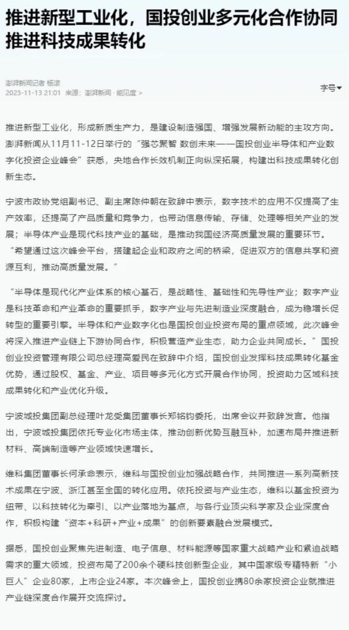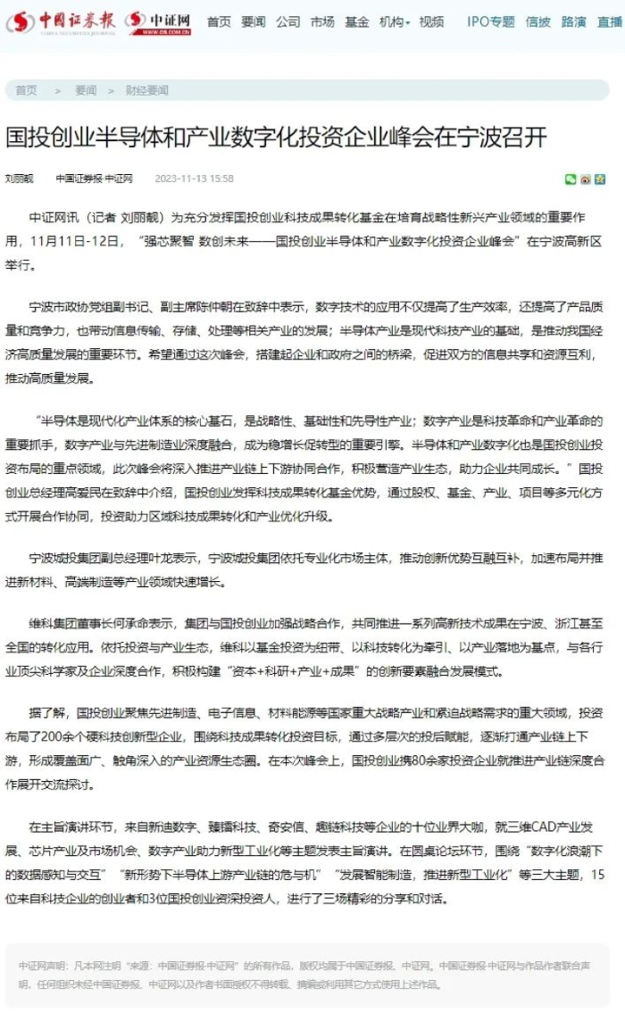 為充分發(fā)揮國(guó)投創(chuàng)業(yè)科技成果轉(zhuǎn)化基金在培育戰(zhàn)略性新興產(chǎn)業(yè)領(lǐng)域的重要作用,11月11-12日,國(guó)投創(chuàng)業(yè)投資管理有限公司、寧波城建投資集團(tuán)有限公司、維科控股集團(tuán)股份有限公司在寧波高新區(qū)共同主辦“強(qiáng)芯聚智 數(shù)創(chuàng)未來(lái)——國(guó)投創(chuàng)業(yè)半導(dǎo)體和產(chǎn)業(yè)數(shù)字化投資企業(yè)峰會(huì)”。