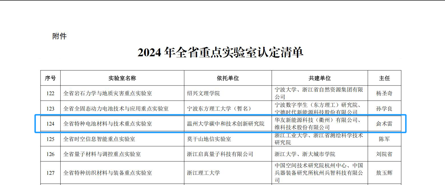 2025年6月3日,浙江省科學(xué)技術(shù)廳發(fā)布了《關(guān)于公布2024年全省重點實驗室認(rèn)定結(jié)果的通知》,維科技術(shù)以共建單位申報的“全省特種電池材料與技術(shù)重點實驗室”成功入選全省重點實驗室名單。