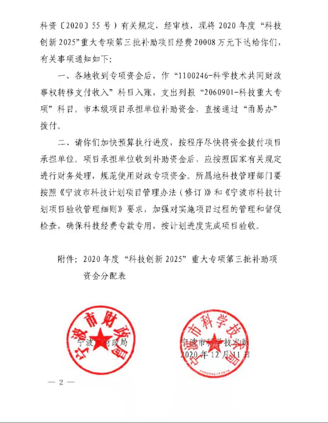 12月15日、寧波市財政局は「寧波市2020年科學(xué)技術(shù)発展特別基金(第3回バッチ補助金の主要特別プロジェクト)の発行に関する通知」(Ningbo Finance [2020] No.1214)を発行し、寧波VEKEN新エネルギーテクノロジー有限公司が宣言した「高安全?高比エネルギー動力リチウムイオン電池の開発」プロジェクトが採択された。 2020年に寧波市から「科學(xué)技術(shù)革新2025」大型特別プロジェクトの受注に成功し、第一期の補助金200萬元を獲得した。
